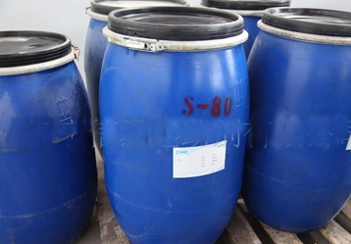 乳化劑S-80,化學(xué)名稱為失水山梨醇單油酸脂。為非離子型表面活性劑,無(wú)毒、無(wú)味;熔點(diǎn)10~20度;HLB值為4.3左右;不溶于水、能溶于熱油類及一般有機(jī)溶劑。能與柴油、機(jī)油、蠟、瀝青等很好地熔合??勺魅榛瘎?、增稠劑、分散劑等。