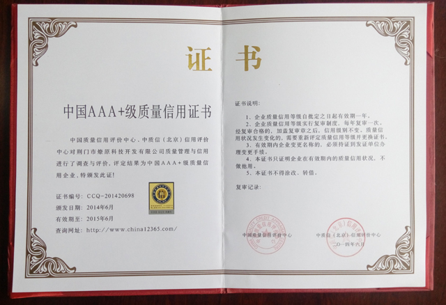 燎原科技AAA+級(jí)質(zhì)量信用證書